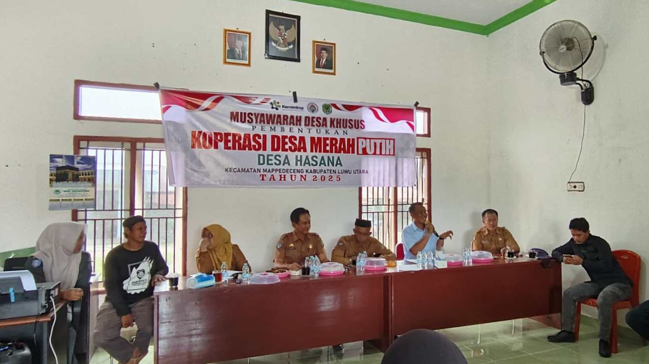 Matapublik-Luwu Utara, Desa Hasana, Kecamatan Mappedeceng, Kabupaten Luwu Utara, melaksanakan Musyawarah Desa Khusus (Musdesus) untuk pembentukan Koperasi Desa Merah Putih. Kegiatan ini dihadiri oleh berbagai unsur masyarakat desa, Kepala Desa, Dinas PPKUKM Luwu Utara, perangkat desa, tokoh masyarakat, tokoh pemuda, BPD, kepala dusun, dan pendamping desa.